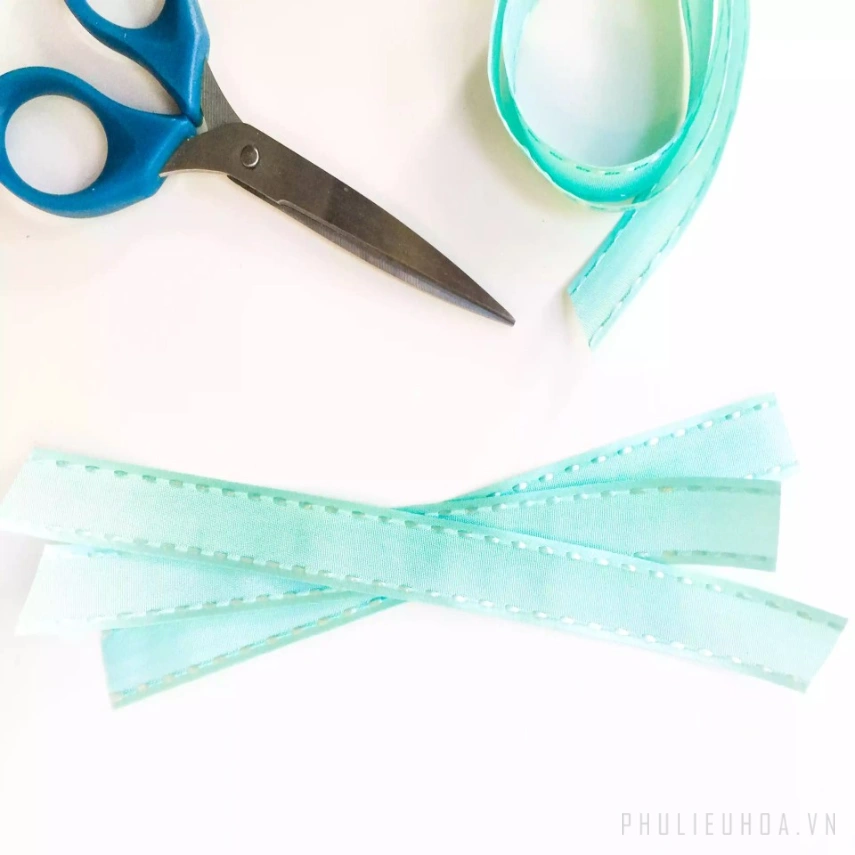 Cắt sáu đến tám dải ruy-băng có chiều dài từ 4 đến 6cm bằng nhau. ruy băng càng dài thì bông hoa cuối cùng càng lớn. Bạn cắt càng nhiều, bông hoa của bạn sẽ càng đầy đặn.