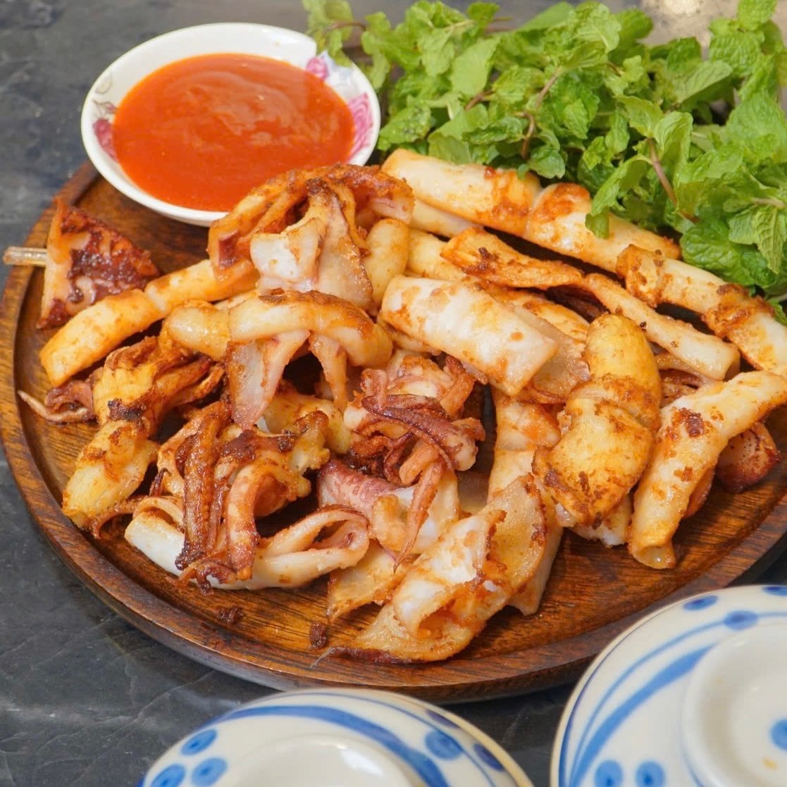 - Khi cắn vào, lớp vỏ ngoài giòn rụm kết hợp cùng phần thịt mực dẻo dai, ngọt vị biển.