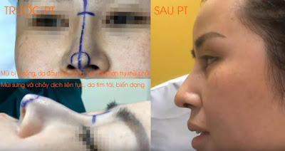 - Mũi hoại tử vật liệu ghép: đây là trường hợp không hiếm, nguyên nhân là do khách hàng ham rẻ thực hiện ở những địa chỉ thẩm mỹ "chui", không có giấy phép hành nghề, chất liệu nâng mũi không được kiểm định. Xem clip mũi hoại tử được bác sĩ Khải làm lại bằng sụn bột: