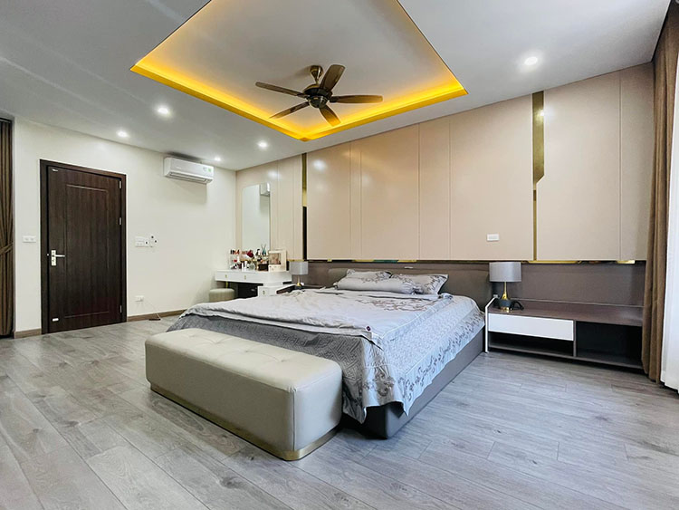 với nội thất phòng ngủ được thiết kế khá sang trọng, nội thất sàn gỗ màu tối, hệ thống tủ âm tường giúp tối giản không gian hơn, thêm hệ thống đèn chiếu sáng giúp mọi không gian thêm thông thoáng hơn rất nhiều.