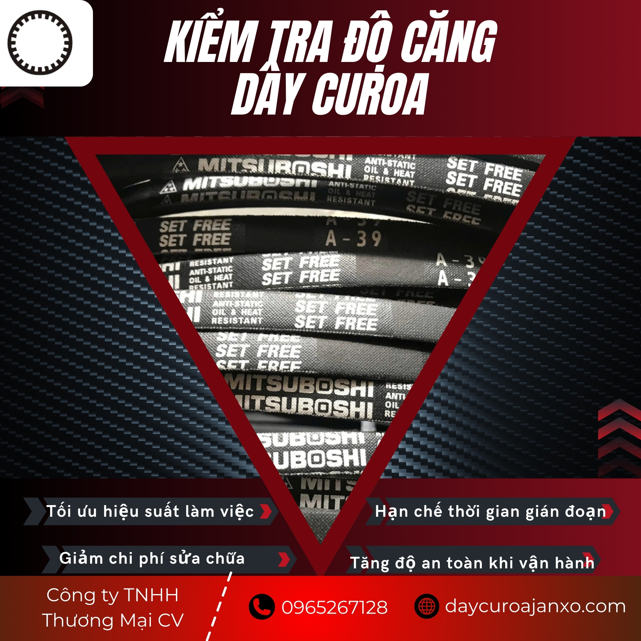 Trong các dây chuyền sản xuất, thiết bị công nghiệp hay phương tiện cơ giới, dây curoa là bộ phận đảm nhận nhiệm vụ truyền tải chuyển động từ động cơ đến các chi tiết làm việc. Độ căng của dây quyết định hiệu quả truyền động, khả năng tiết kiệm năng lượng và độ bền của toàn bộ hệ thống. Chính vì vậy, kiểm tra độ căng dây curoa đúng kỹ thuật là bước không thể thiếu để đảm bảo thiết bị duy trì sự ổn định lâu dài. Công ty TNHH Thương Mại CV luôn nhấn mạnh tầm quan trọng của việc kiểm tra định kỳ, đồng thời cung cấp giải pháp toàn diện cho khách hàng trong nhiều ngành nghề.