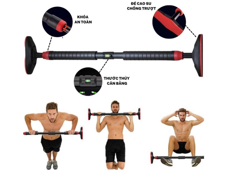 Sản phẩm nổi bật với chốt xoay khóa chặt hai đầu chống nhả ren, phần đế PVC dạng chữ nhật có rãnh tăng ma sát giúp bám chắc vào tường, cùng bộ phận đo cân bằng ở giữa hỗ trợ lắp đặt chính xác. Xà phù hợp cho nhiều bài tập như hít xà, nâng chân, gập bụng… giúp rèn luyện cơ tay, vai và bụng hiệu quả tại nhà.