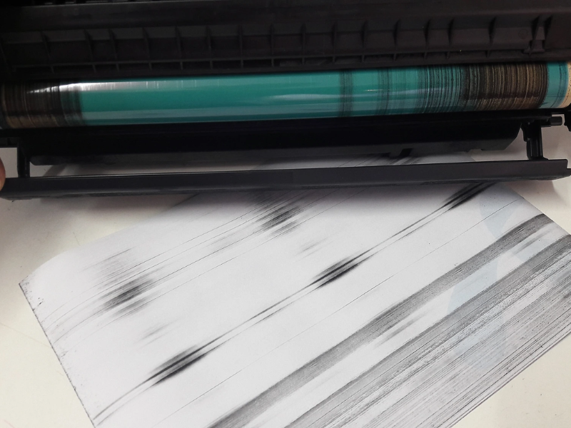 - Có tiếng kêu lạ khi in, có thể do gạt mực hoặc trống bị lệch.